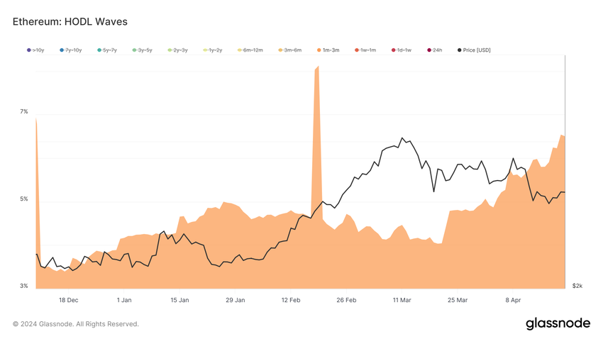 Dit sentiment wordt ook waargenomen in de verschuiving van het aanbod van investeerders op korte termijn naar investeerders op middellange termijn. De adressen die hun assets voor één tot drie maanden aanhouden, hebben een toename van 638.000 ETH waargenomen die meer dan $2 miljard waard zijn.