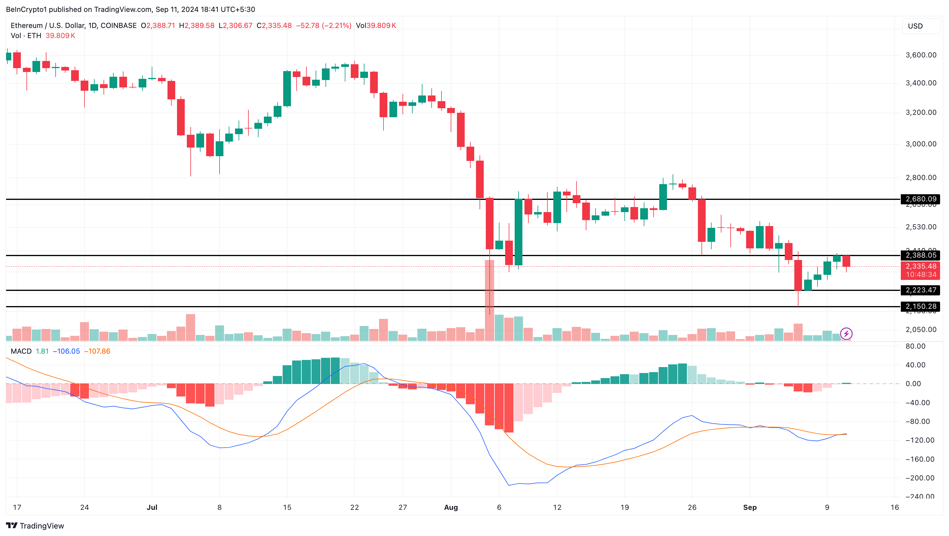 De dagelijkse analyse van Ethereum toont een terugkeer naar de neerwaartse trend na een korte prijsstijging. Op 7 september steeg ETH van $2.223 naar $2.388, maar het gebrek aan aanzienlijk handelsvolume zorgde ervoor dat de opwaartse beweging stopte.