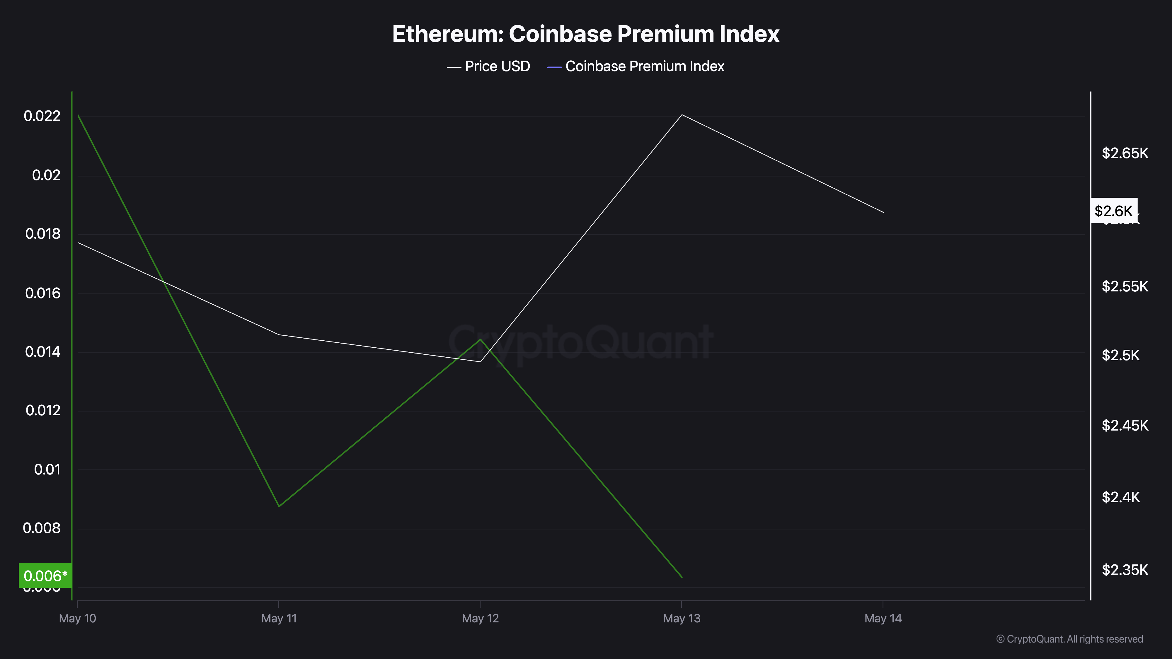 Volgens CryptoQuant bereikte de Coinbase Premium Index (CPI) van ETH op 10 mei een wekelijkse piek van 0,022 en is sindsdien gedaald. Op het moment van schrijven staat de metriek op 0,0063.