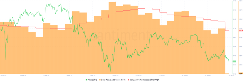 ETH’s dagelijks actieve adressen vertonen een gestage daling sinds 30 maart, wat het bearish verhaal ondersteunt. Deze metriek is van vitaal belang omdat het netwerkactiviteit en gebruikersbetrokkenheid weerspiegelt, met een neerwaartse trend die wijst op verminderd gebruik en interesse.