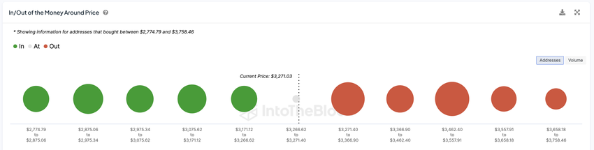 De In/Out of the Money Around Price (IOMAP) grafiek laat zien dat Ethereum momenteel wordt omringd door krappe steun- en weerstandsniveaus in de buurt van de huidige koers. Deze tool biedt inzicht in potentiële koersdruk door aan te geven waar in het verleden veel werd gekocht of verkocht.