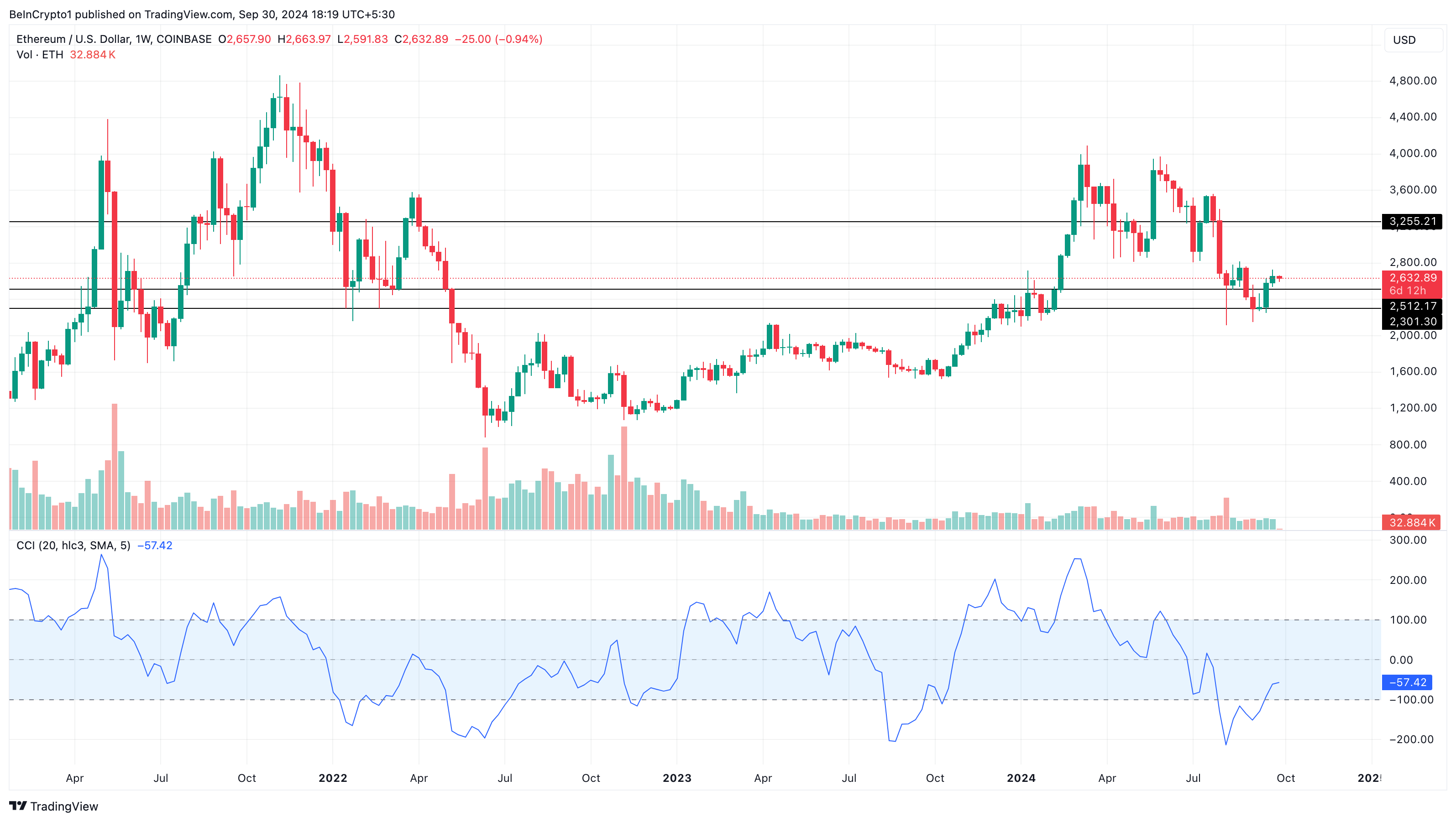 Een blik op de wekelijkse grafiek van Ethereum onthulde dat de Commodity Channel Index (CCI) is gestegen. De CCI is een technische indicator die het verschil meet tussen de huidige koers en de historische gemiddelde waarde, en wordt vaak gebruikt om mogelijke overbought- of oversold-condities te identificeren.