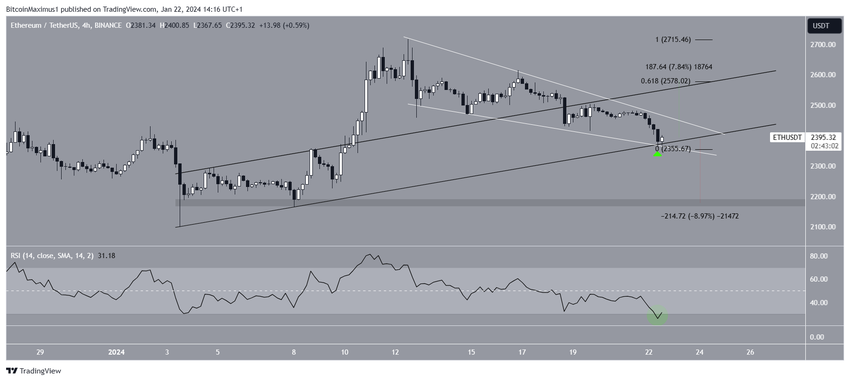 Ondanks deze bullish verwachting van de ETH koers, kan een uitbraak uit het kanaal een daling van 9% veroorzaken naar de dichtstbijzijnde steun op $2.170.