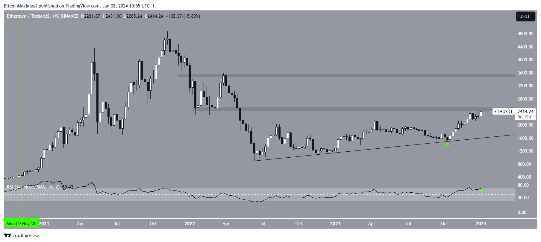 De Ethereum koers is gestegen langs een stijgende steuntrendlijn sinds mei 2022. De trendlijn is verschillende keren gevalideerd, het meest recent in oktober 2023 (groene pijl). Sindsdien heeft ETH acht bullish candlesticks in elf weken gemaakt. Het is momenteel bezig aan een negende candlestick.