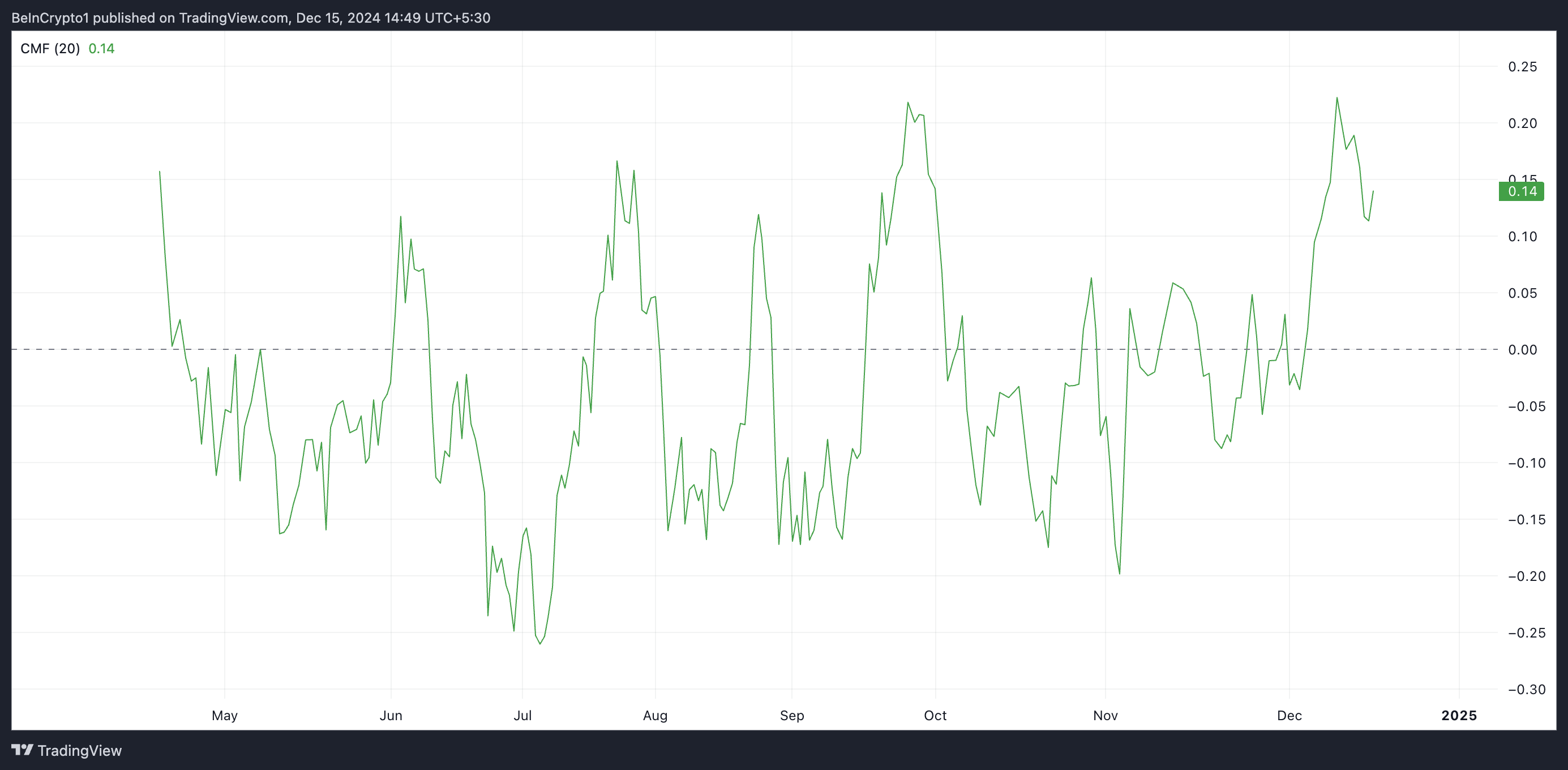 ENA’s positieve Chaikin Money Flow (CMF) bevestigt de hoge vraag naar de altcoin. Op het moment van schrijven staat de waarde van de indicator op 0,14.