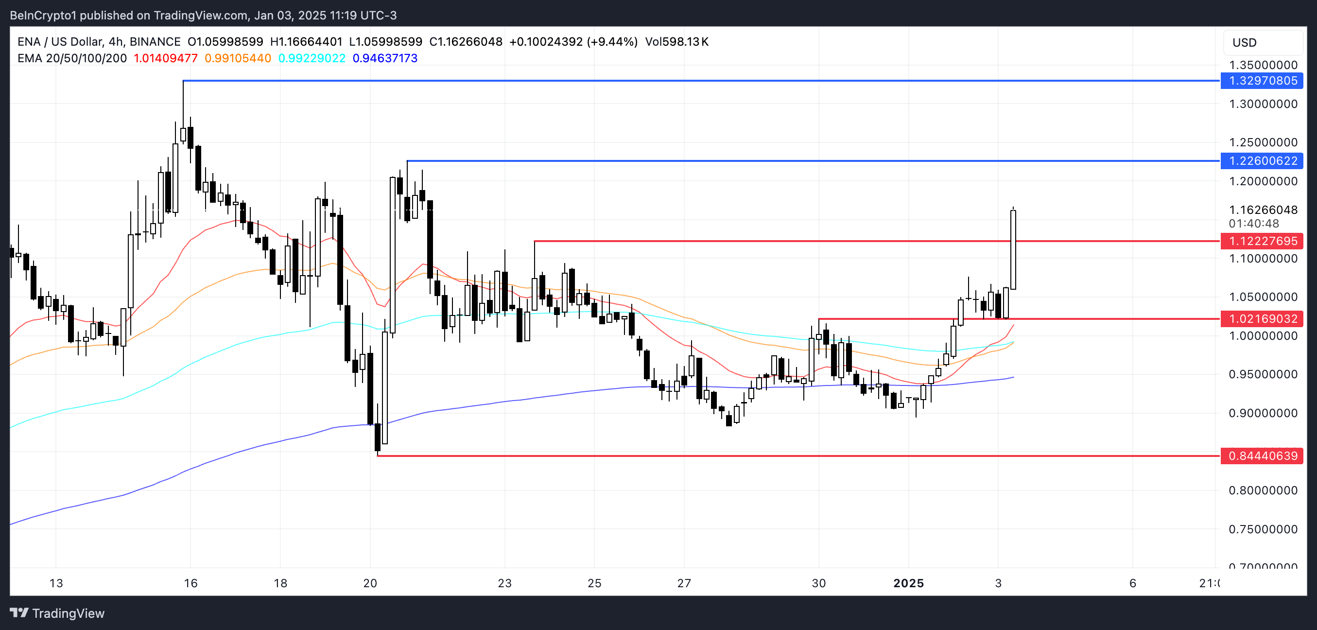De EMA-lijnen van ENA hebben onlangs een golden cross gevormd, een bullish signaal dat optreedt wanneer korte-termijn moving averages boven lange-termijn moving averages kruisen. Deze ontwikkeling wijst op een mogelijke verschuiving in momentum naar aanhoudende opwaartse koersactie.