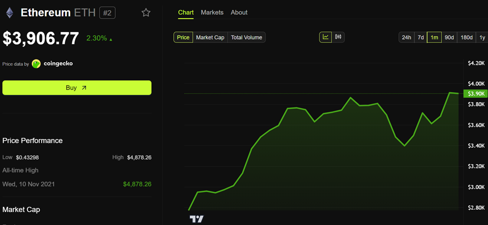 Op het moment van schrijven werd Ethereum verhandeld voor $3.906. Maar de grote vraag is of de koers wordt tegengehouden net voordat het de $4.000-grens bereikt.