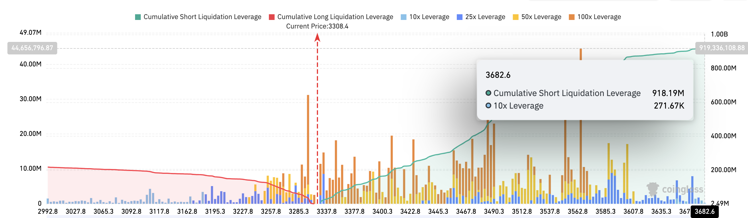 Momenteel zijn ETH longposities ongeveer $218 miljoen waard, wat benadrukt dat shorts de bullish blootstelling met $700 miljoen hebben overtroffen. Het is echter belangrijk op te merken dat als de Ethereum koers stijgt richting $3.700, de meeste van deze posities met hoge hefboomwerking mogelijk liquidatie kunnen ondergaan.