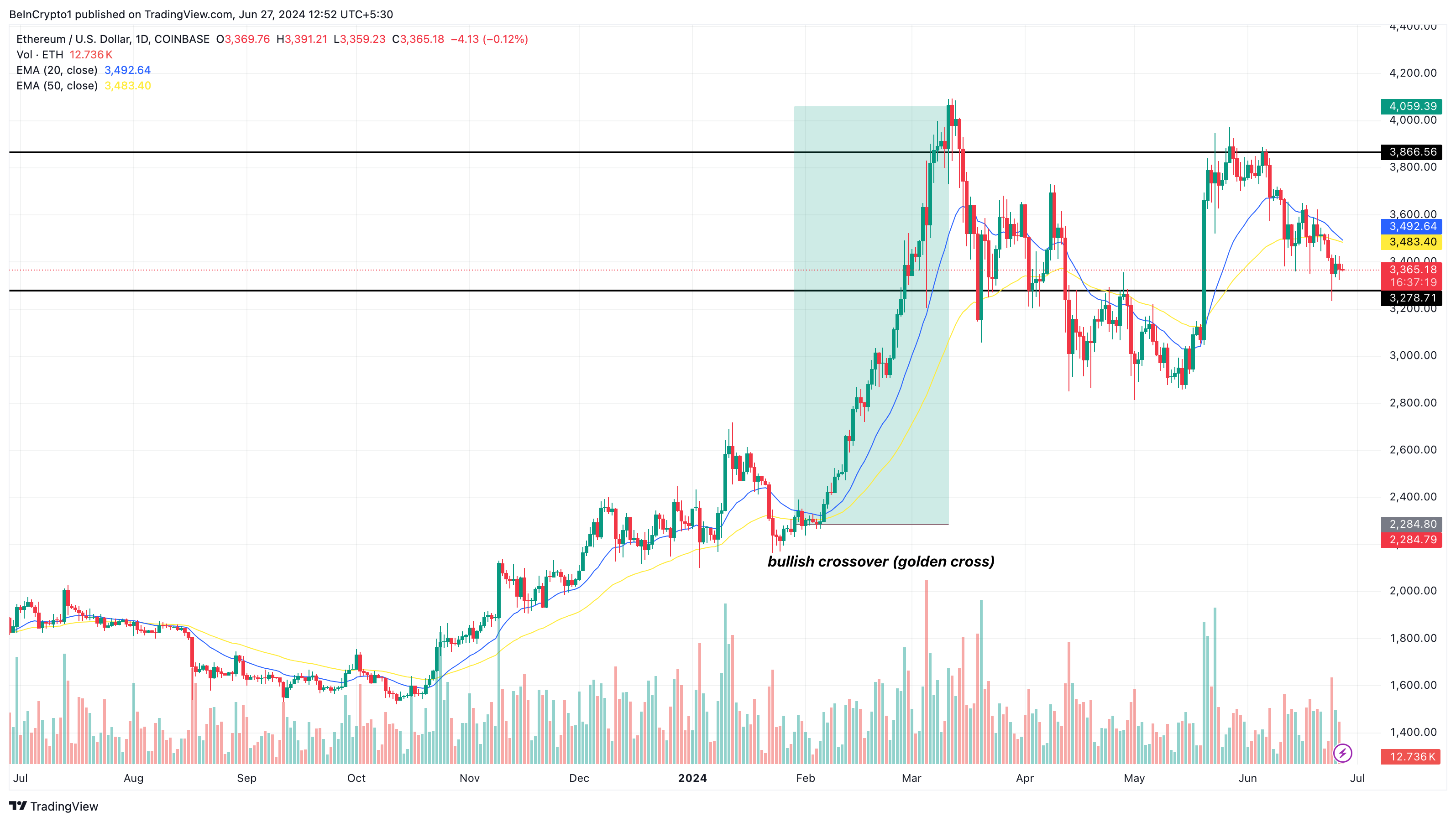 Beide EMA’s staan echter op het punt om hetzelfde punt te bereiken. Als dit gebeurt, zal de ETH koers zijwaarts bewegen en mogelijk consolideren tussen $3.355 en $3.610. Als de 20 EMA echter de 50 EMA omdraait (bullish crossover), zou de altcoin de weerstand van $3.866 kunnen bereiken.