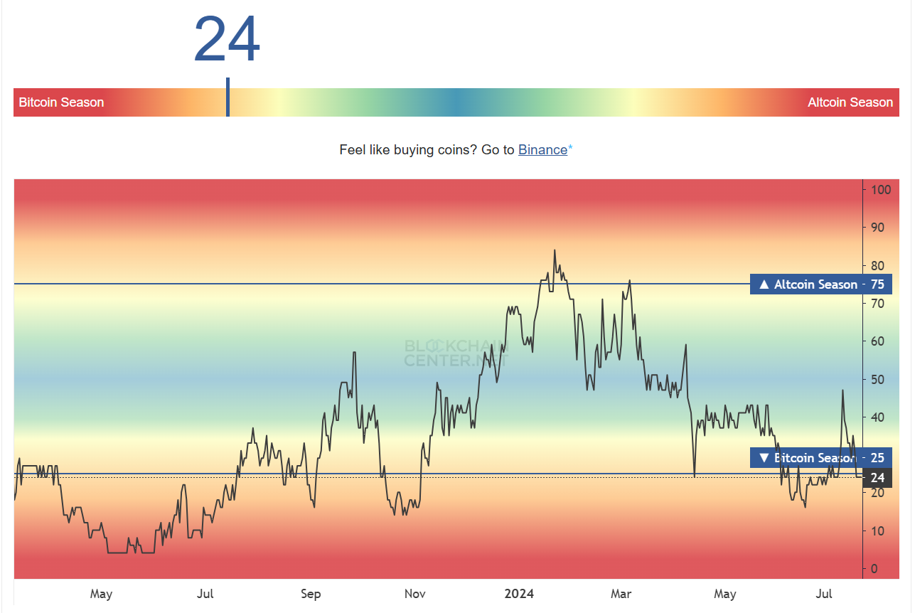 De Altcoin Season Index laat zien dat de huidige marktomstandigheden een actief Bitcoin-seizoen ondersteunen. Om de BTC-dominantie te laten afnemen, zouden altcoins een instroom moeten aantrekken die groter is dan de instroom in Bitcoin.
