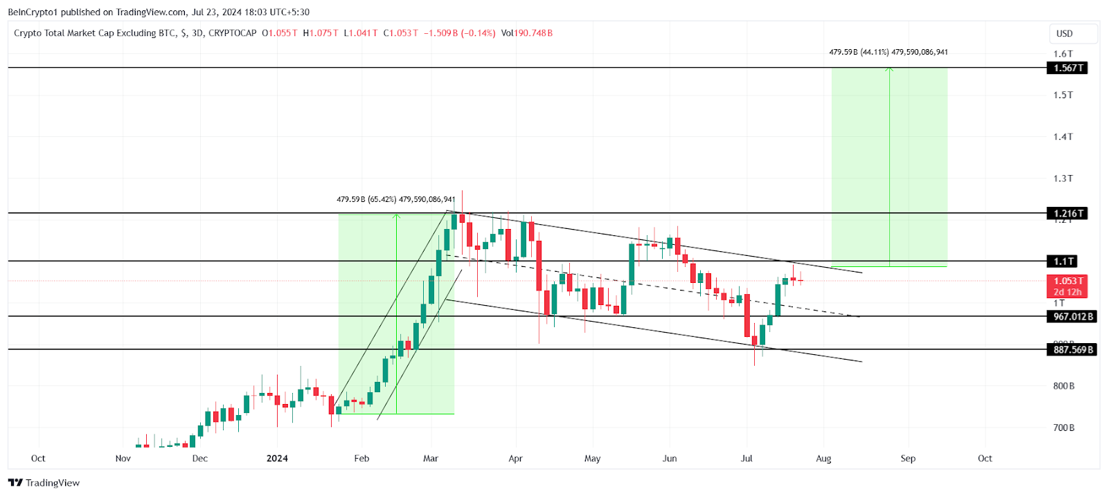 De gecombineerde marktkapitalisatie van assets anders dan BTC staat momenteel op $1,05 biljoen, en beweegt zich binnen een vlagpatroon. Een vlagpatroon is een grafiekpatroon voor technische analyse dat lijkt op een rechthoekige vlag. Het geeft een korte consolidatie aan voordat de vorige trend wordt hervat.