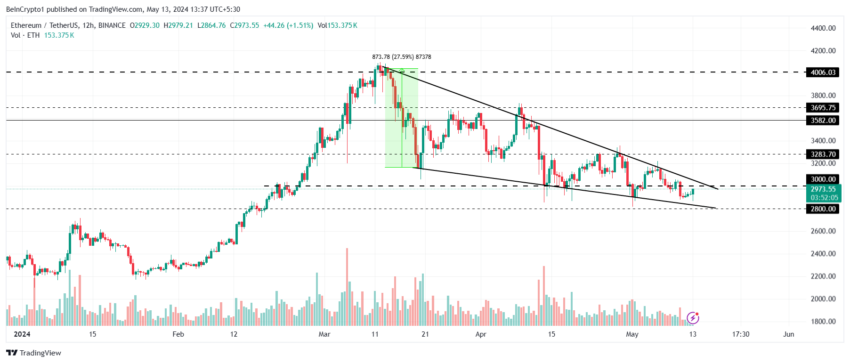 Op het moment van schrijven is te zien dat de prijs van Ethereum van eigenaar wisselt op $2.973, nadat het de afgelopen dagen onder $3.000 is gezakt. ETH zit vast in een dalende wig en wacht op een breakout boven de bovenste trendlijn, die samenvalt met $3.000.