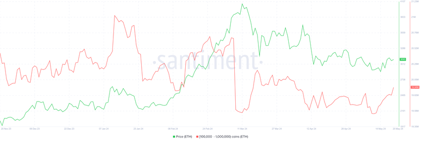 De adressen die tussen 100.000 en 1 miljoen ETH houden, hebben iets meer dan 390.000 ETH toegevoegd, een aanbod ter waarde van $1,26 miljard, waarmee de holdings van de whales naar 19,94 miljoen ETH zijn gestegen. Deze koopgolf vond plaats in de afgelopen week.