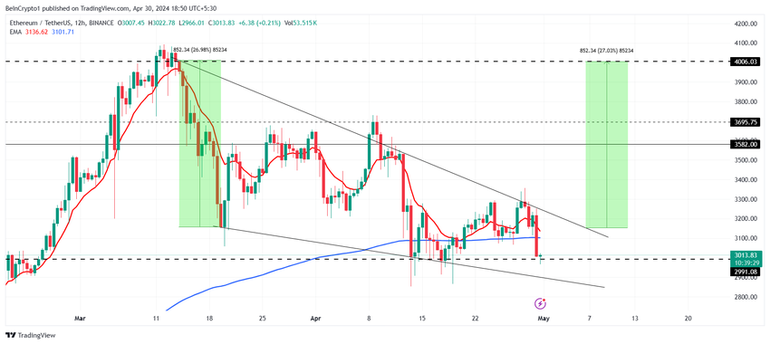 De ethereum koers op $3.000 houdt het $2.991 prijspunt vast als een steunbodem die beweegt binnen de dalende wig. Dit bullish chartpatroon wordt gekenmerkt door convergerende trendlijnen met lagere highs en lagere lows. Dit duidt op een potentiële trendomkeer wanneer de koers naar boven uit de wigformatie breekt.