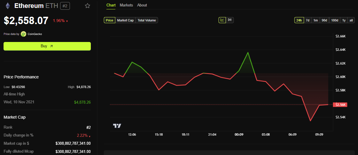 SponsoredOndanks de ambitieuze plannen van de Ethereum Foundation is de ETH koers in de afgelopen 24 uur met bijna 2% gedaald. Op het moment van schrijven werd het verhandeld voor $2.558.