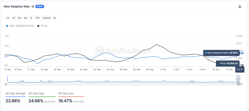 New Adopters’ Participation rate op het Ethereum netwerk steeg tot maar liefst 34% op respectievelijk 26 september en 14 oktober. De laatste keer dat dit in twee opeenvolgende maanden gebeurde, was in oktober en november 2022.