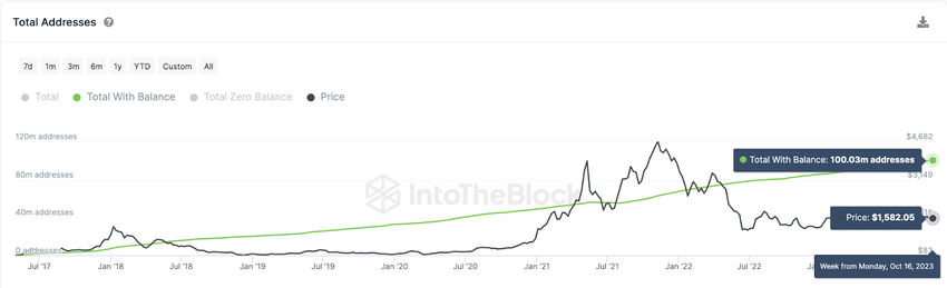 Ethereum bereikte een all-time high van 100 miljoen non-zero balance adressen op 16 oktober, volgens on-chain data verzameld door IntoTheBlock.