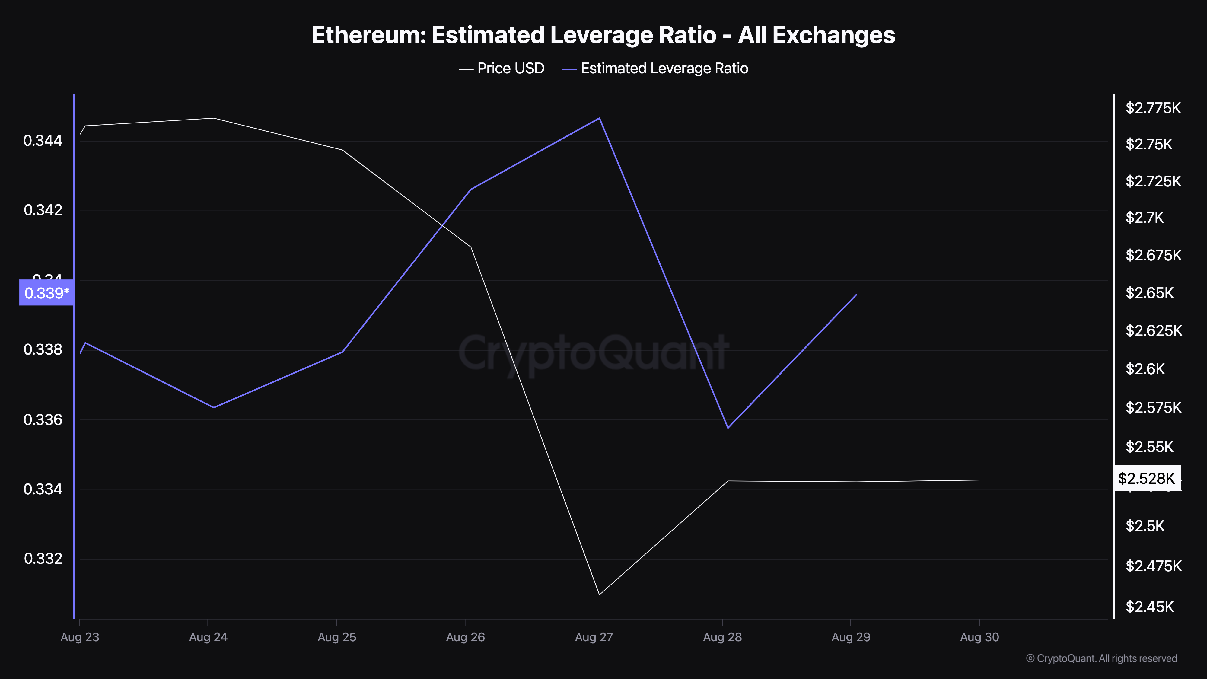 Volgens CryptoQuant is de geschatte hefboomratio (ELR) van Ethereum onlangs gestegen, wat aangeeft dat investeerders steeds meer high-leverage weddenschappen aangaan op de derivatenmarkt. Dit suggereert toenemend vertrouwen in een significante koersbeweging.
