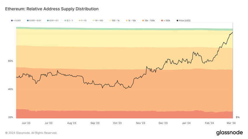 De veerkracht van ETH holders is zichtbaar in hun gedrag. Noch heeft het aanbod op exchanges een stijging gezien in de afgelopen maand, wat over het algemeen duidt op potentiële verkoop, noch heeft de balans van whales (adressen die tussen de 100 en 100.000 ETH houden) een sterke dip opgemerkt.