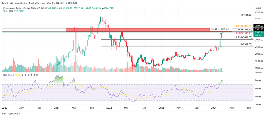 De koers van Ethereum, die op het moment van schrijven wordt verhandeld op $3.527, is de afgelopen drie weken met 40% gestegen en heeft highs van meerdere maanden bereikt. De altcoin van de tweede generatie komt nu dichter bij het testen van de weerstandszone tussen $3.582 en $3.829. Dit gebied is al bijna drie jaar een kritieke barrière voor ETH.