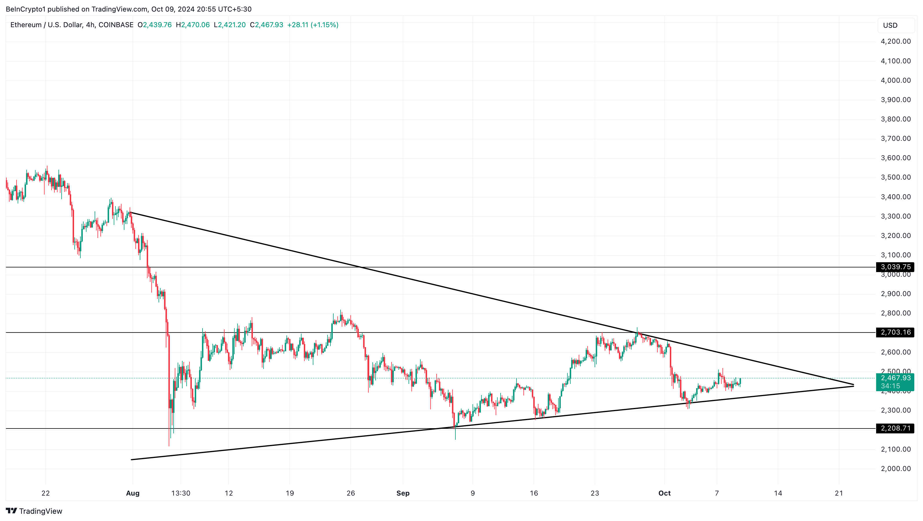 Gebaseerd op de 4-uursgrafiek handelt Ethereum momenteel op $2.468 en beweegt binnen een stijgende driehoek sinds juli. Hoewel dit patroon zowel bullish als bearish uitkomsten kan hebben, suggereert de grafiek dat ETH waarschijnlijker onder de driehoek zal breken dan erbovenuit.