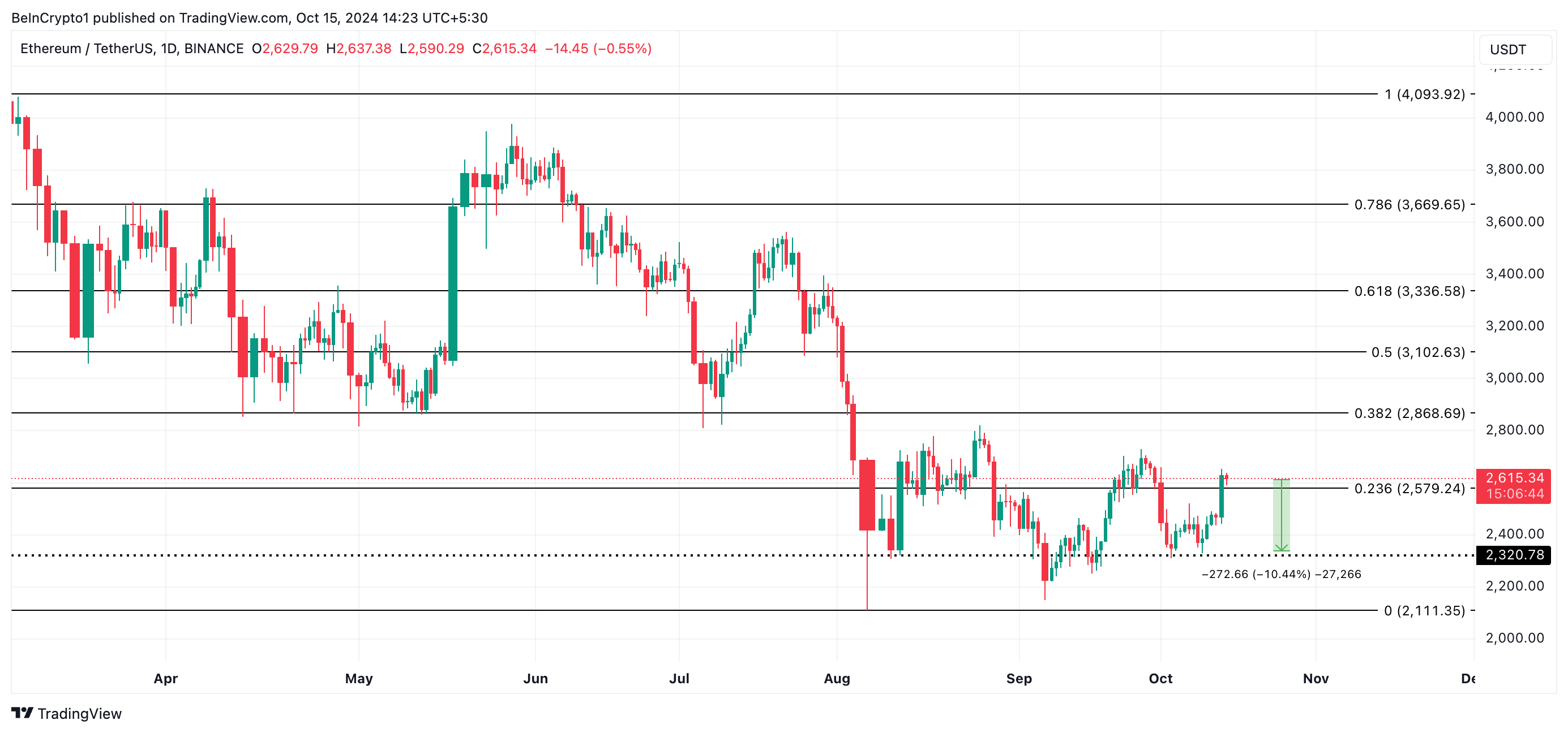 De Ethereum koers kan dalen naar de weerstand bij $2.579 als de verkoopactiviteit toeneemt. Als dit niveau niet als steun fungeert, kan de koers van de altcoin verder dalen naar de steun die gevormd is bij $2.320, wat een daling van 10% vertegenwoordigt vanaf de huidige waarde van $2.616.
