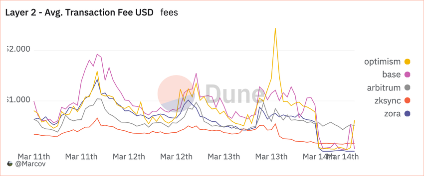 Na de upgrade daalden de gemiddelde kosten op Optimism naar $0,05, terwijl die van Arbitrum daalden naar $0,5. De gemiddelde transactiekosten op Base daalden naar $0,064, terwijl die van zkSyncEra daalden naar $0,161. De mediane kosten op Optimism daalden naar $0,0038, terwijl vergelijkbare kosten op Base, Arbitrum en zkSyncEra daalden naar $0,0008, $0,3553 en $0,0936.