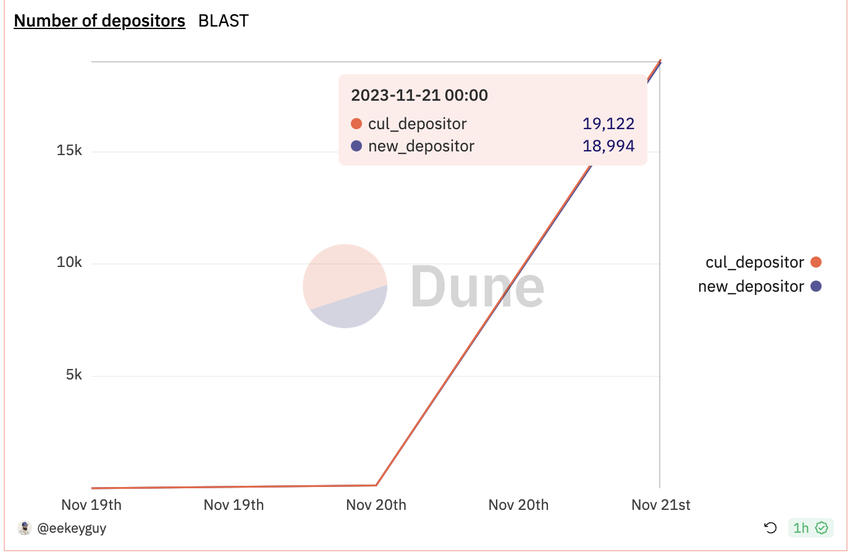 De screenshot hieronder van een dashboard van Dune laat zien dat meer dan 19.000 adressen geld hebben gestort op Blast.