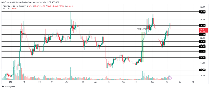 De koers van Ethhereum Name Service (ENS) heeft een rode candlestick geschilderd op de dagelijkse grafiek in een poging om boven $ 26 te sluiten.
