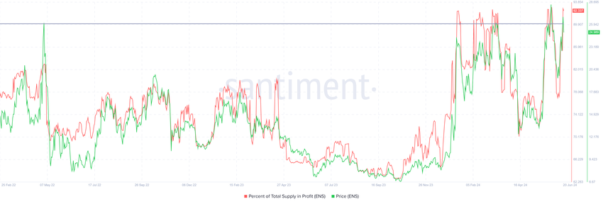 In de afgelopen tien dagen registreerde de ENS koers een enorme rally, waardoor het totale aanbod in winst 90% overschreed. Dit markeerde een markttop voor ENS. Een markttop is het hoogste punt in een marktcyclus voordat een sterke daling begint. Het vertegenwoordigt de piek van de koersen van assets voordat ze beginnen te dalen.