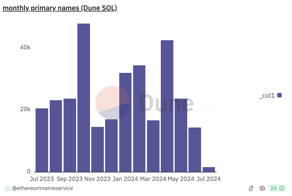 Gedurende deze 30 dagen bedroeg het aantal geregistreerde primaire ENS-namen 14.401, een daling van 39% MoM en een daling van 55% ten opzichte van de 31.982 primaire namen die aan het begin van het jaar werden geregistreerd.