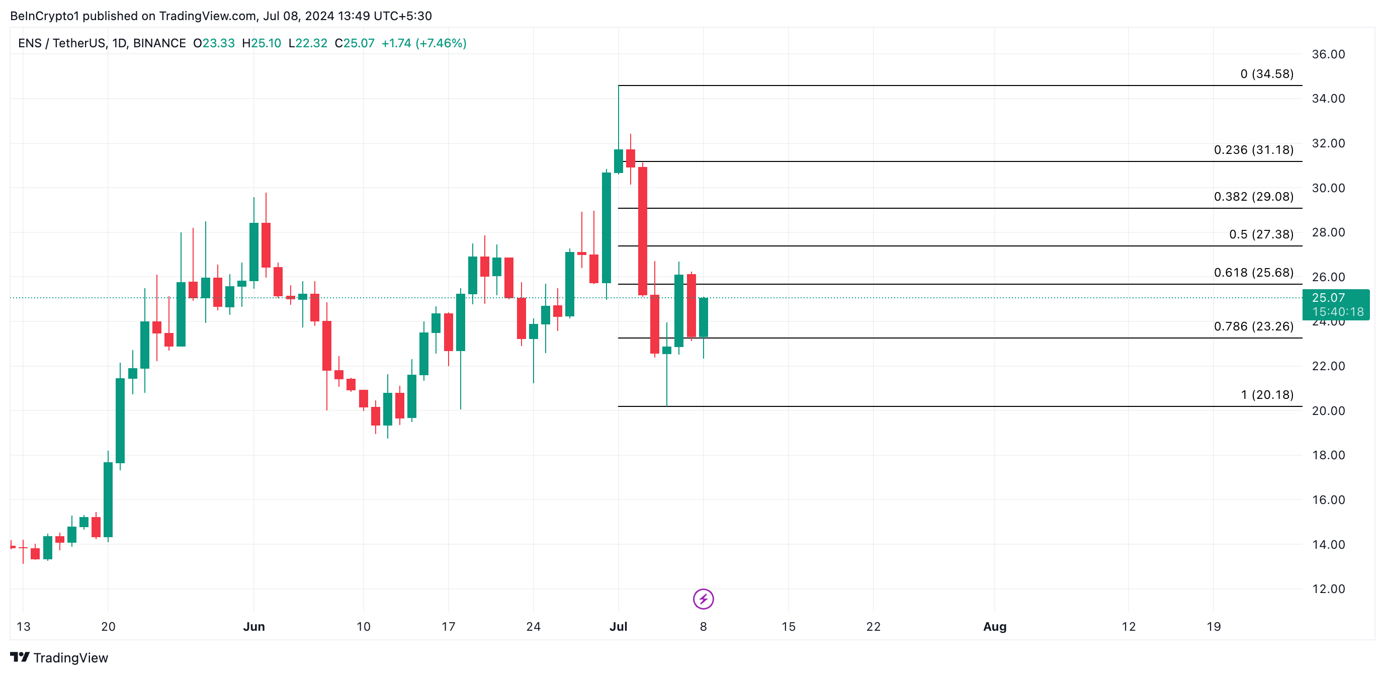 Als de koopactiviteit echter weer toeneemt, zal de bovenstaande bearish verwachting worden ontkracht, omdat de Ethereum Name Service koers zal stijgen richting $25,68.