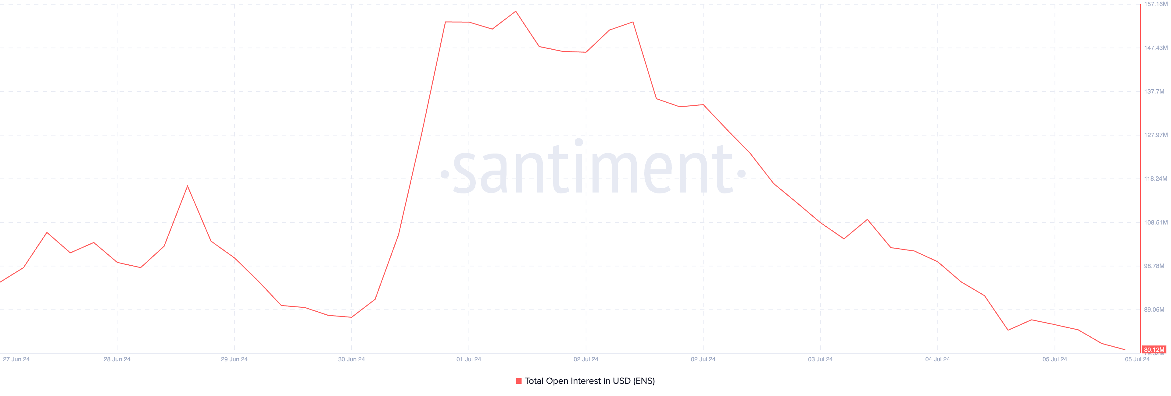 BeInCrypto meldde eerder dat de open interest van ENS’ derivaten klom naar een all-time high van $153 miljoen op 1 juli. Sindsdien is het echter gedaald. Met $80,12 miljoen bij het ter perse gaan is de open interest van Ethereum Name Service binnen zeven dagen met 48% gedaald.