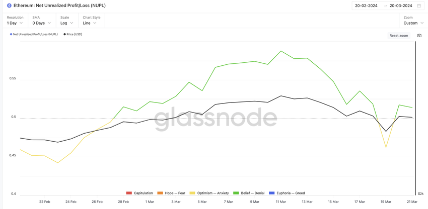 De ETH Net Unrealized Profit/Loss (NUPL) metriek schommelt tussen de ‘Optimism – Anxiety’ en ‘Belief – Denial’ toestanden, wat suggereert dat een sterk deel van de ETH investeerders hun holdings in een positief licht zien.