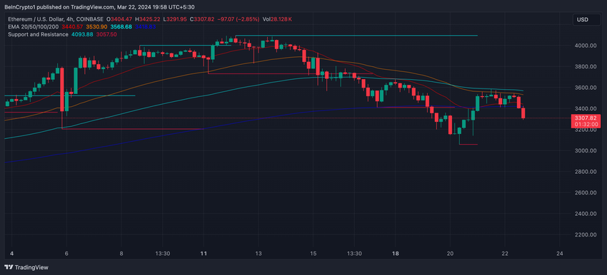 Als deze bearish trend zich doorzet, zoals de EMA-lijnen suggereren, dan zou de ETH koers binnenkort de $3.000 kunnen testen, een kritieke steunzone.