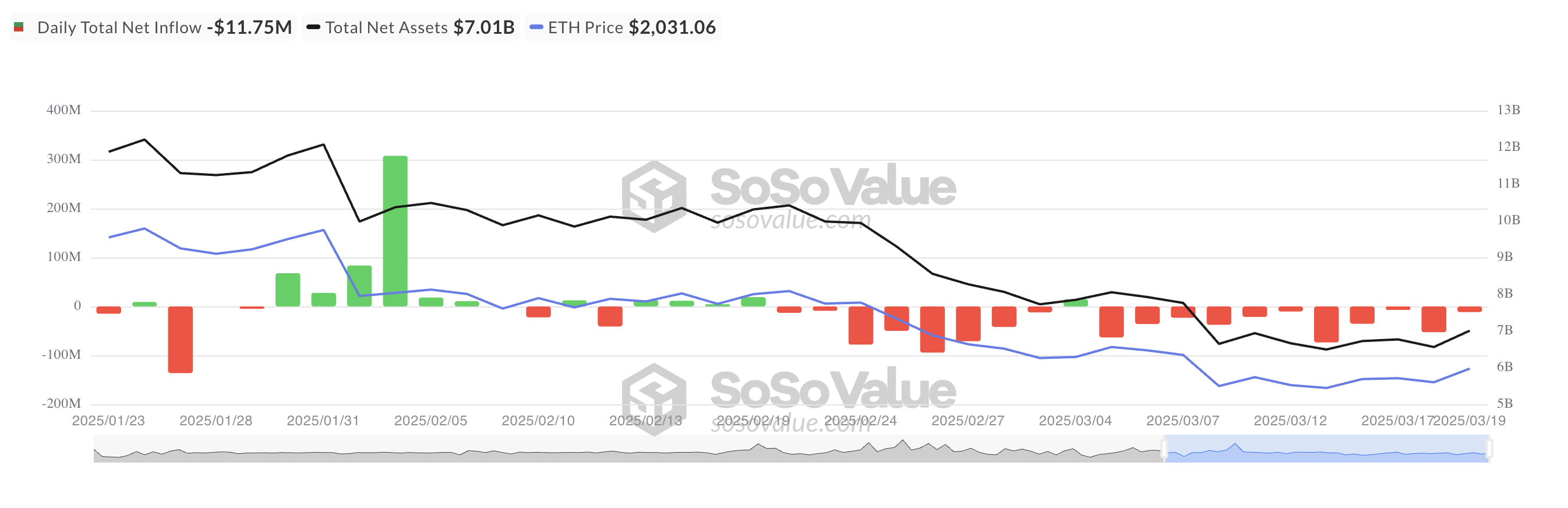 Het sentiment van investeerders is overweldigend bearish gebleven, met slechts één dag van instroom deze maand. De totale nettovermogenswaarde van alle Amerikaanse spot ETF’s bedraagt momenteel $7,01 miljard, een daling van 44% year-to-date.