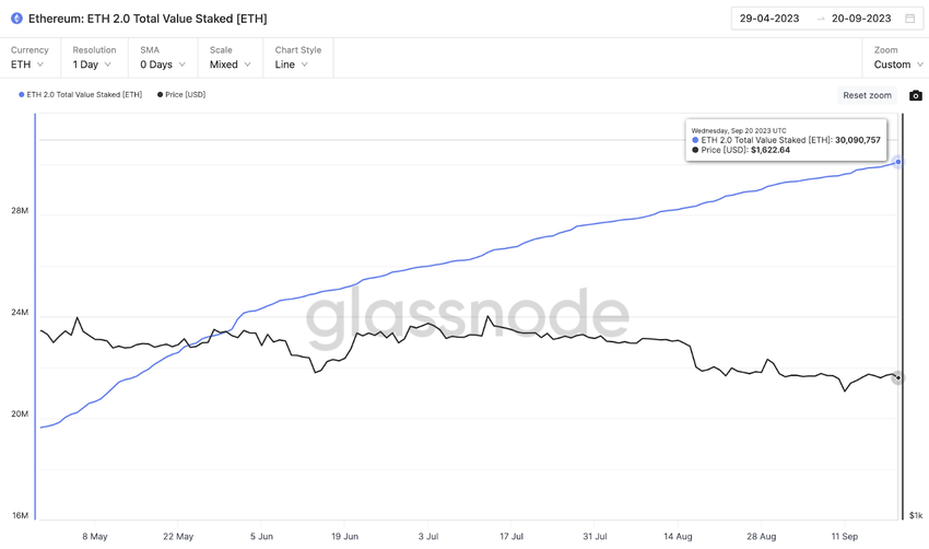 Zoals hieronder te zien is, stond de ETH 2.0 Total Value Staked op 31 augustus op 29,23 miljoen ETH. Dit was 20 september gestegen tot 30,09 miljoen ETH.
