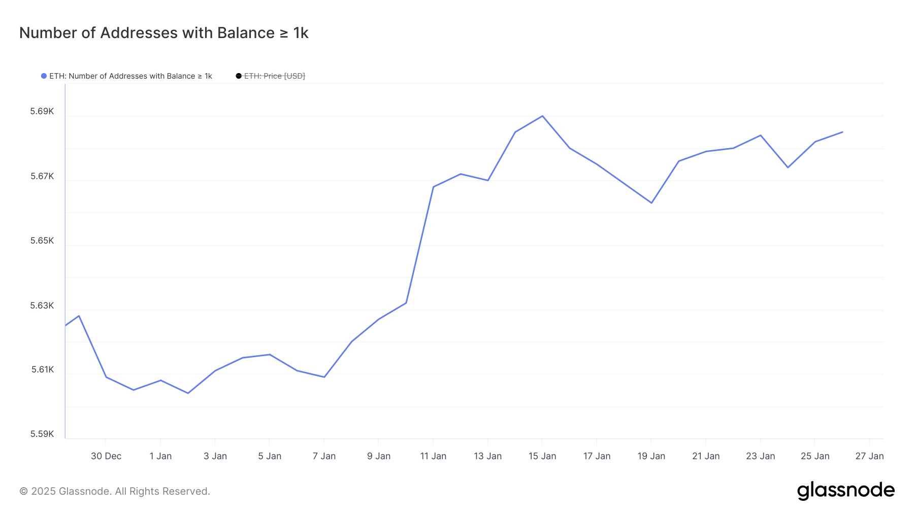 Het aantal wallets met ten minste 1.000 ETH, bekend als whales, is begonnen te herstellen na een scherpe daling tussen 15 januari en 19 januari, toen het aantal daalde van 5.690 naar 5.663.