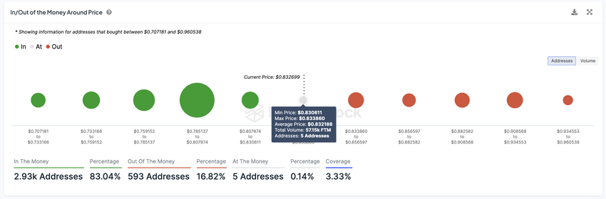 De meeste adressen, ongeveer 83,04% of 2.930, zijn “In the Money”, wat aangeeft dat ze FTM kochten tegen koersen onder de huidige koers van $0,83. Dit creëert een sterke steunzone. Dit creëert een sterke steunzone rond $0,73 tot $0,75, waar een sterk aantal aankopen plaatsvond.