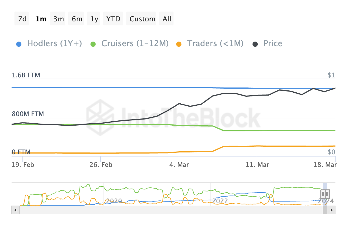 Van 7 maart tot 18 maart steeg het aantal FTM tokens in handen van korte-termijn traders – die de asset minder dan een maand houden – van 95 miljoen naar een indrukwekkende 206 miljoen. Een sterke groei van 116%.