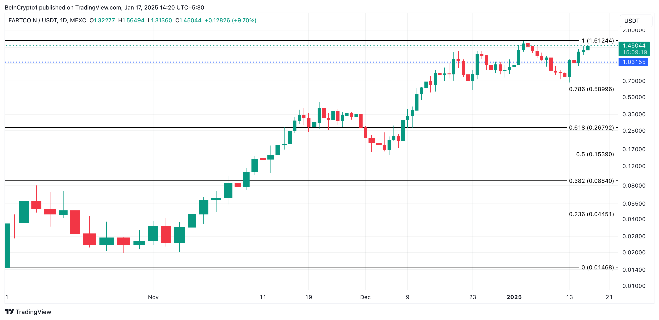 Solana-gebaseerde meme coin FARTCOIN is met 20% gestegen in de afgelopen 24 uur en is de grootste stijger op de markt. De token wordt momenteel verhandeld op $1,45, net onder zijn all-time high van $1,61.