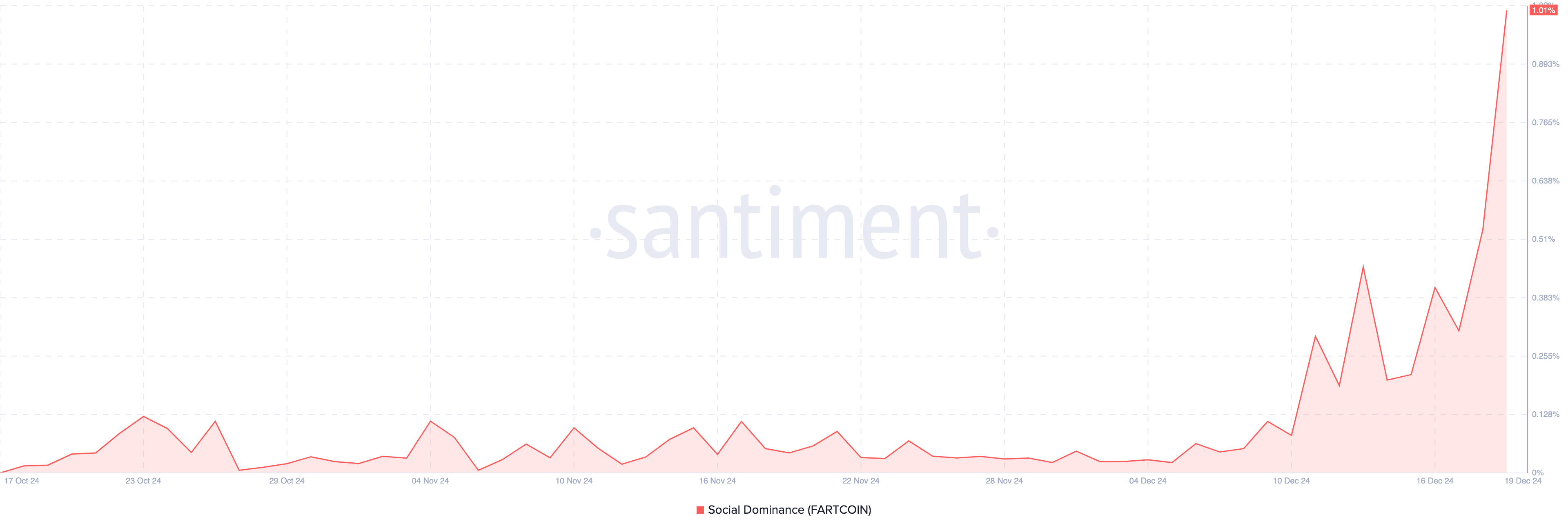 Bovendien is Fartcoin’s sociale dominantie gestegen naar 1,01%. Deze metriek meet het volume van discussies rond een cryptomunt vergeleken met andere in de top 100.