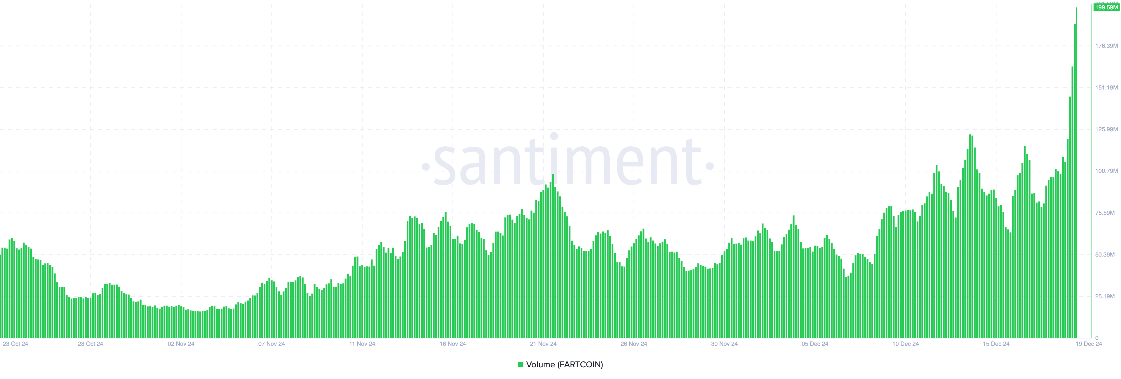 Vanuit een koersperspectief is stijgend volume in combinatie met een stijgende koers een sterke bullish indicator. Momenteel heeft het handelsvolume van Fartcoin een nieuwe all-time high van $199,59 miljoen bereikt.