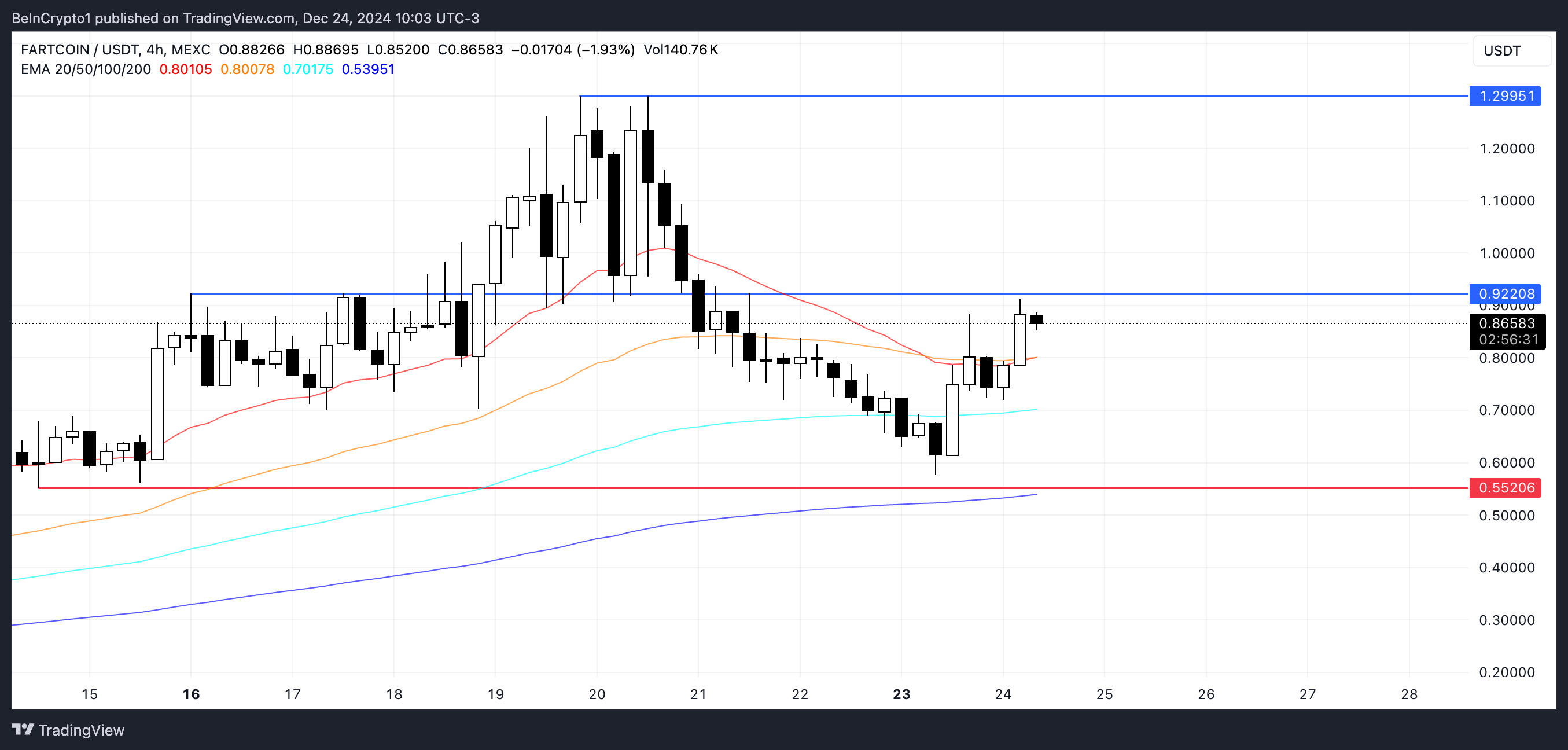 FARTCOIN koers bereikte een nieuwe all-time high op 20 december, met zijn marktkapitalisatie stijgend naar $1,2 miljard. Echter, de token heeft sindsdien een scherpe correctie ondergaan, met zijn marktkapitalisatie nu op $882 miljoen na een daling van 30% in de afgelopen vier dagen. Het begon echter zijn trend te herstellen, met een stijging van 33% in de afgelopen 24 uur.