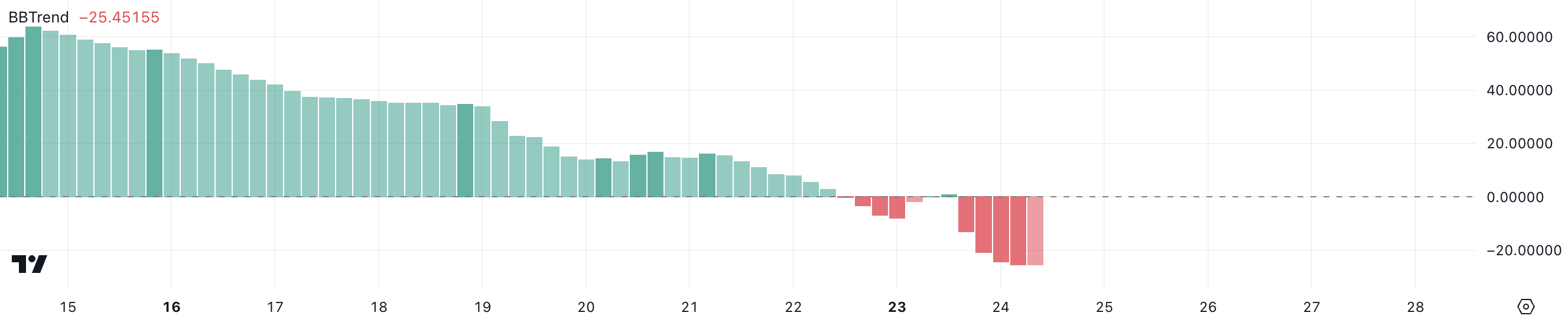 BBTrend, of Bollinger Band Trend, is een momentumindicator afgeleid van Bollinger Bands die de relatie meet tussen de koers van een asset en het middelpunt van zijn banden. Positieve BBTrend-waarden duiden op bullish momentum, terwijl negatieve waarden bearish omstandigheden benadrukken.