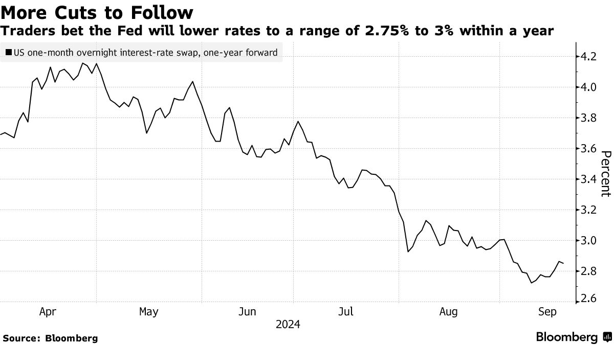 Goldman Sachs was iets gematigder. Voor recente gebeurtenissen voorspelde het 25-basispunten verlagingen in Q4 2024, maar nu verwacht het dat deze verlagingen verspreid zullen worden. Het voorspelt dat de 25-basispunten verlaging geleidelijk plaatsvindt tussen november 2024 en juni 2025, met een doelrente van 3,25% tot 3,50%.