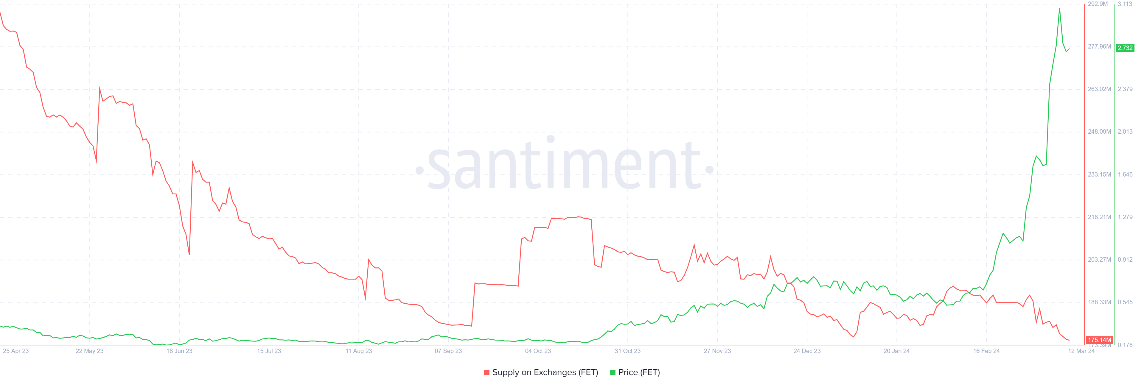 Particuliere investeerders lijken dit echter tegen te gaan, ondanks het feit dat ze een sterke minderheid van het circulerende aanbod in handen hebben. Het totale aanbod van exchanges daalt, wat suggereert dat investeerders FET accumuleren.