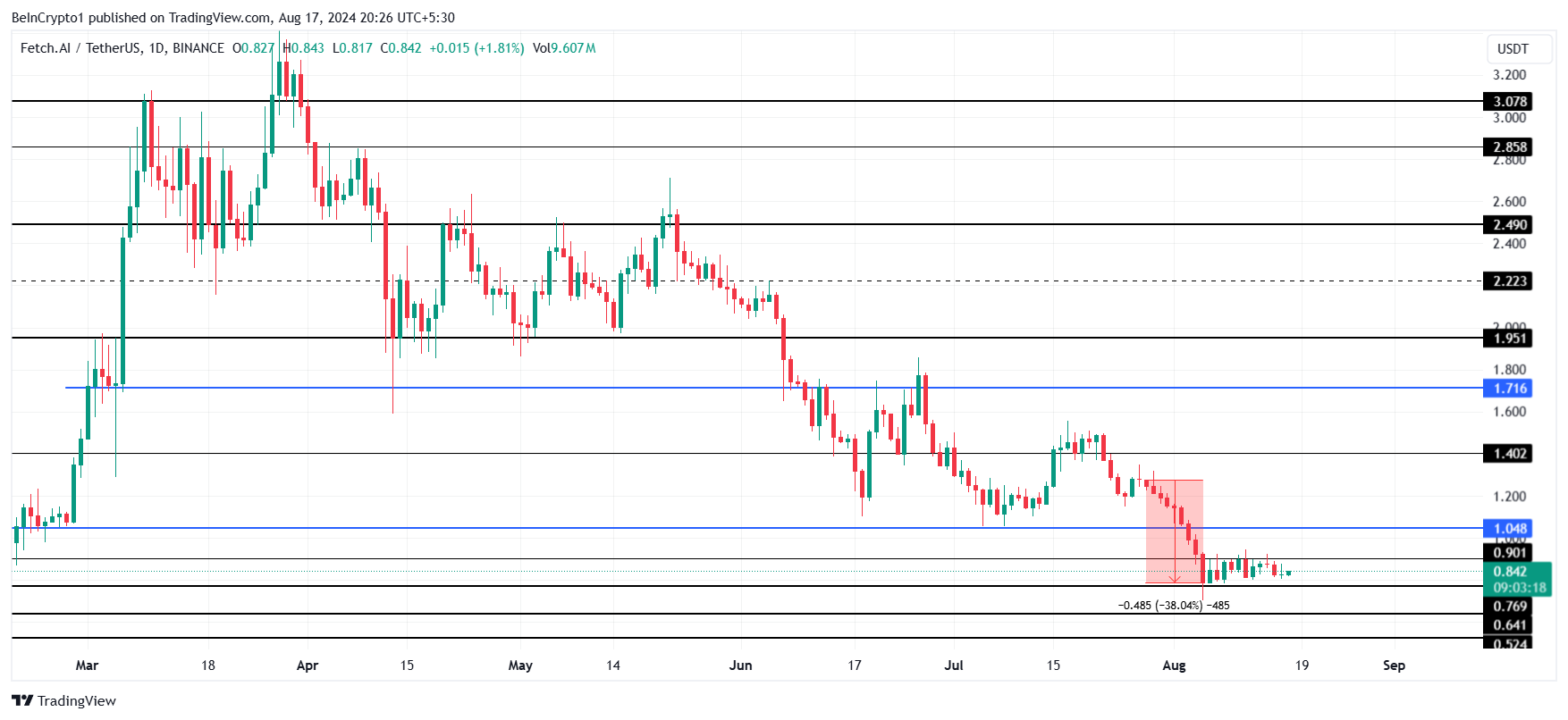 FET koers is geconsolideerd onder de weerstand van $0.90 voor meer dan een week, momenteel handelend op $0.84. Door te stuiteren van de steun op $0.76, heeft de altcoin meerdere potentiële dalingen voorkomen.
