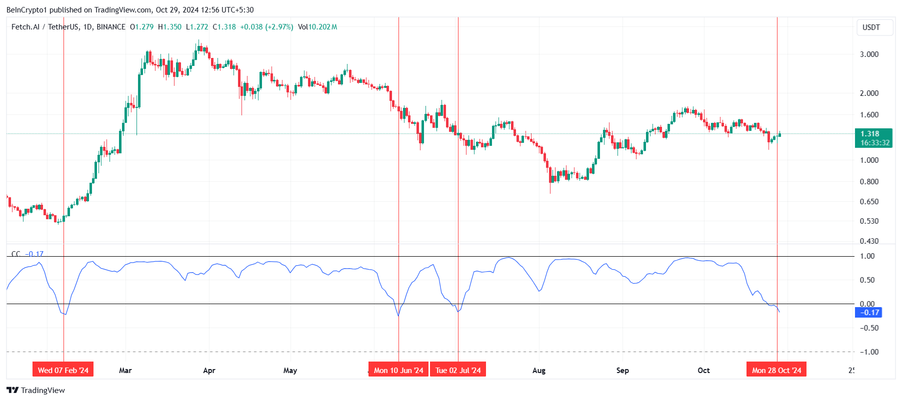 Over het algemeen worden negatieve correlaties voorzichtig bekeken, omdat de bewegingen van Bitcoin de cryptomarkt sterk beïnvloeden. Voor FET duidt een negatieve correlatie echter historisch gezien op het begin van een herstelfase. Deze omgekeerde relatie biedt FET de kans om af te wijken van de bredere markttrends.