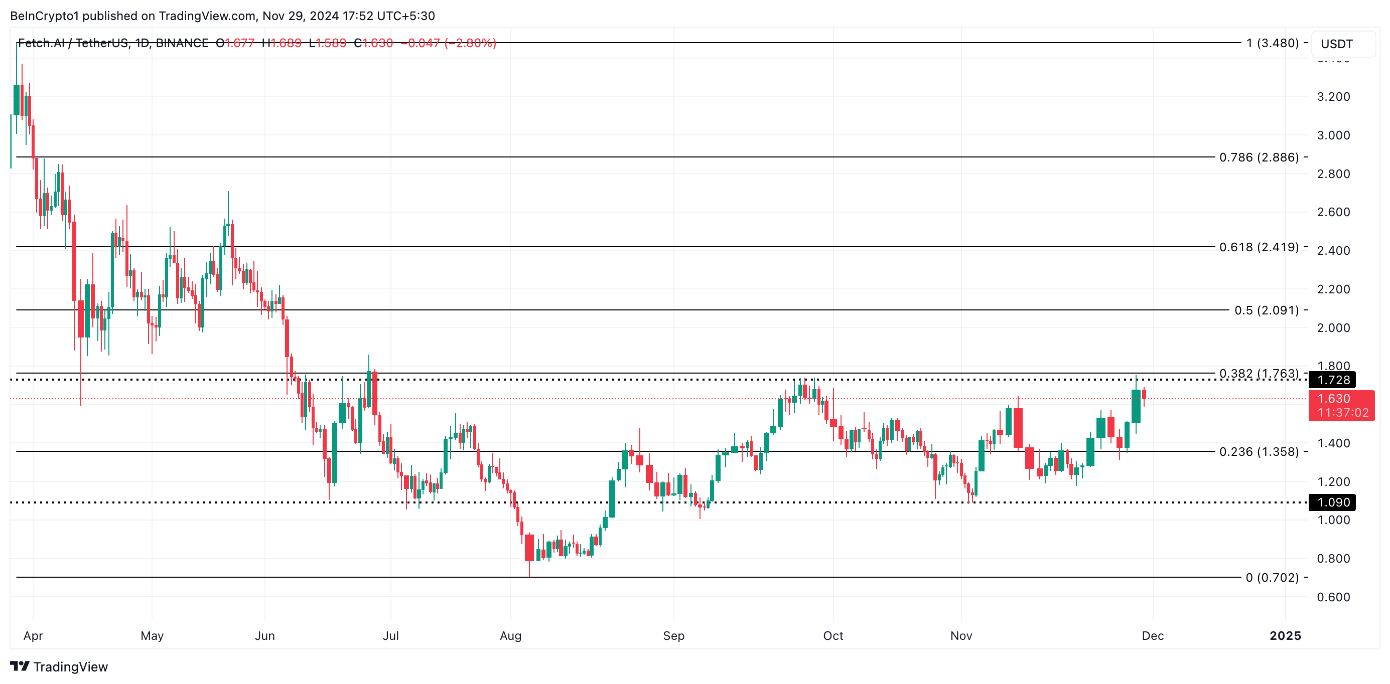 Op een dagelijkse grafiek handelt FET sinds juni binnen een horizontaal kanaal. Dit kanaal wordt gevormd wanneer de koers van een asset fluctueert tussen parallelle steun- en weerstandsniveaus, wat wijst op een periode van consolidatie of range-bound trading. Sinds juni heeft FET weerstand ondervonden op $1,72 en steun gevonden op $1,09.